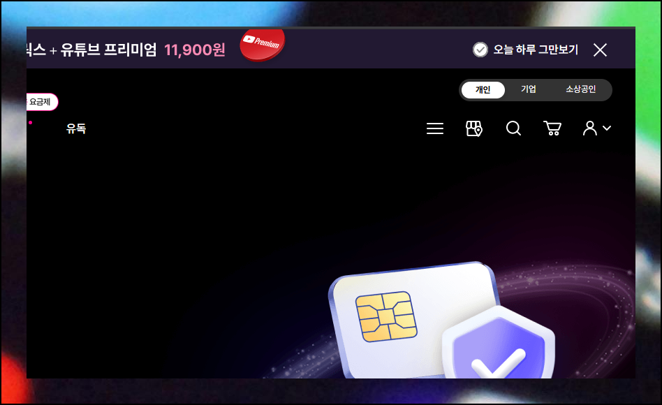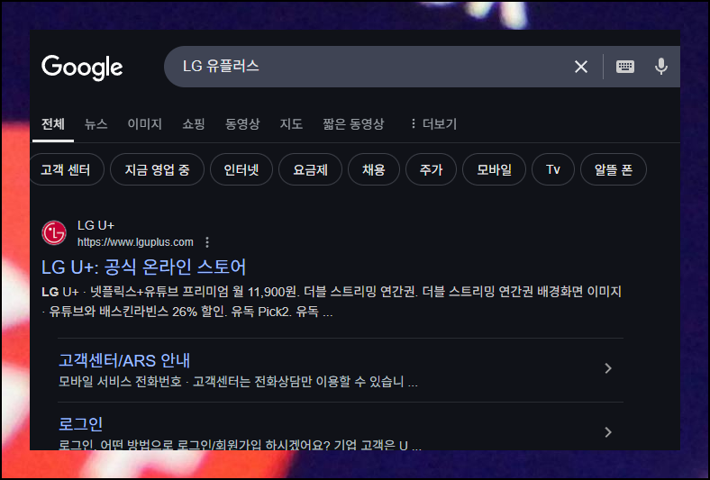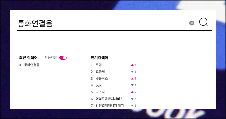 LG 유플러스 첫 화면에서는 복잡한 항목 대신 간편한 방식으로 접근해보세요. 상단 우측에 위치한 돋보기 모양을 터치하면 즉시 검색창이 등장합니다.