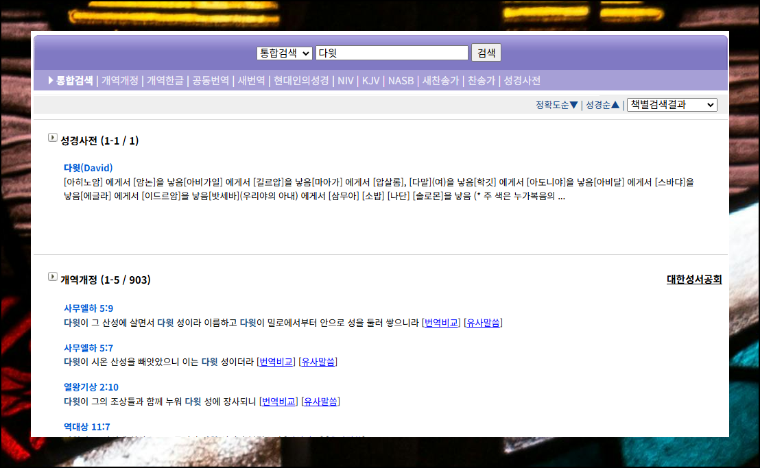 검색을 하면 결과가 잘 정리되어 나타납니다. 먼저 해당 단어의 사전 내용이 나오고, 이어서 다양한 버전별 구절을 확인할 수 있어요.
