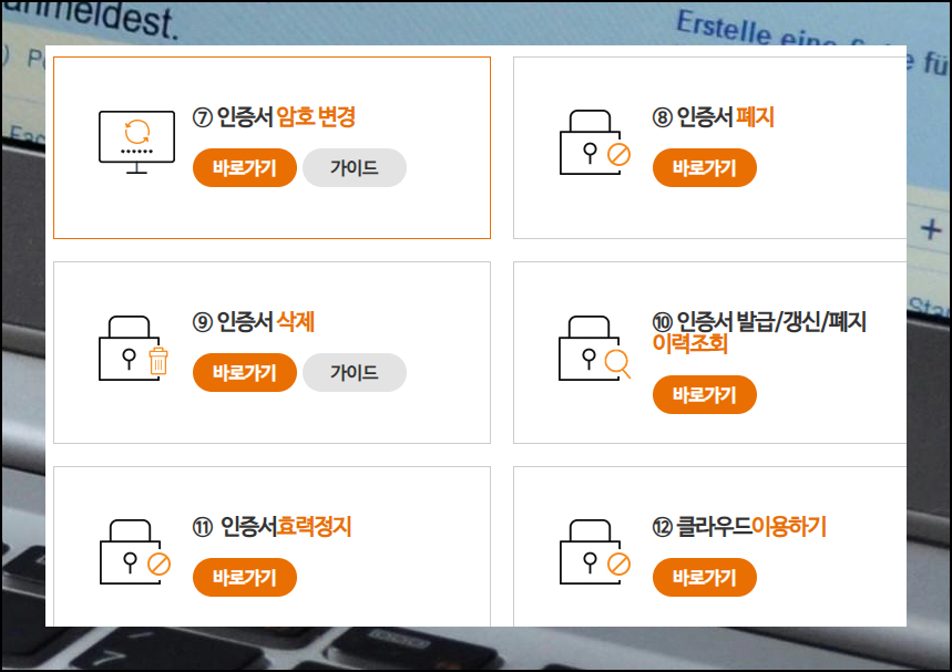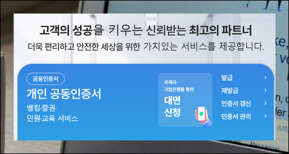 이곳에서는 발급, 갱신, 재발급 등 다양한 서비스를 이용할 수 있는데요. 지금은 비밀번호 찾기에 집중하지만, 다른 기능도 필요할 때 활용해보세요.