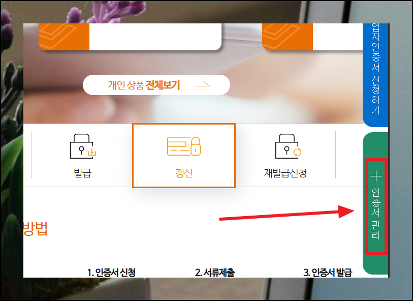 한국정보인증 사이트에 접속한 후, 사용 중인 공동인증서 종류를 선택해주세요. 그 다음 화면 우측에 있는 [관리] 탭을 클릭하면 됩니다.