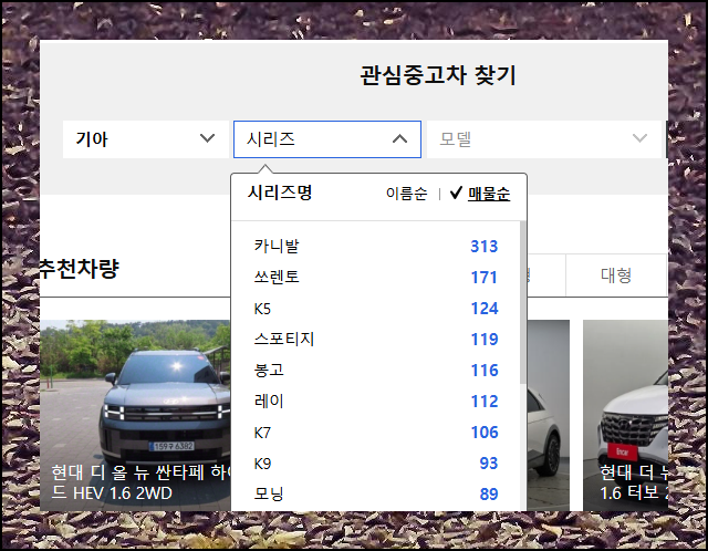 신속하게 업데이트가 되는 매물 정보를 한눈에 볼 수 있는 사이트를 이용해 보려고 하는데요. 특히 현대나 기아처럼 국내에서 인기 있는 브랜드의 매물은 양이 많이 많기 때문에 시세표 보기 수월합니다.