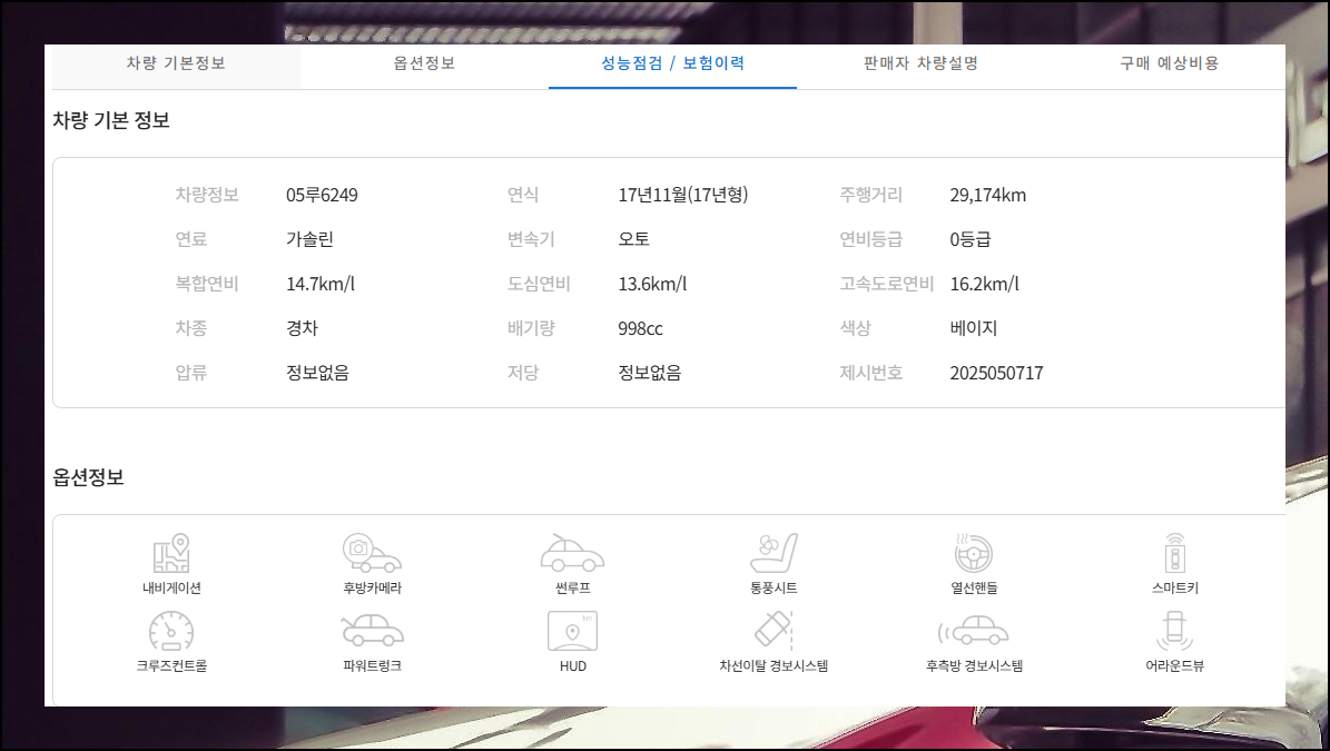시세표에서는 기본 내용만 확인할 수 있지만, 특정 중고 매물을 골라보면 더 상세한 차량 정보를 볼 수 있어요. 자동차 옵션, 성능점검 결과, 판매자 데이터 등 추가적인 항목을 확인할 수 있습니다.