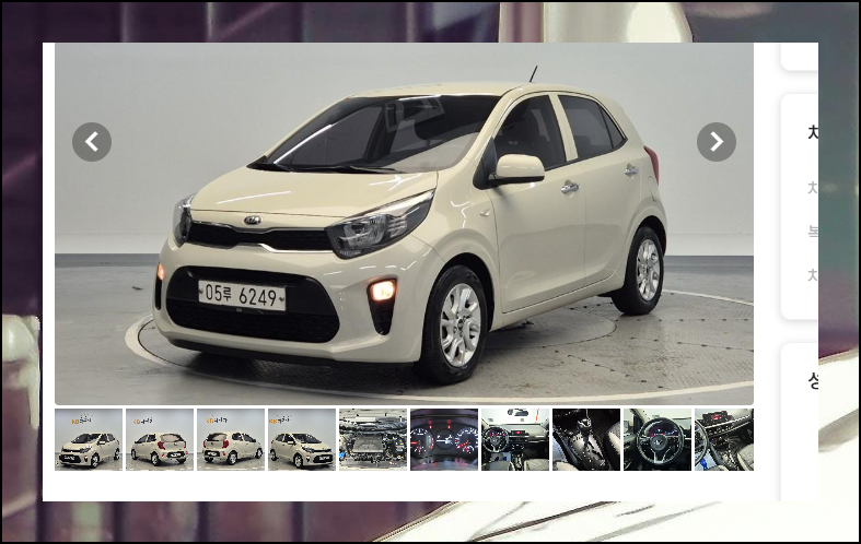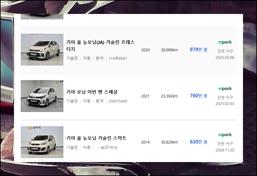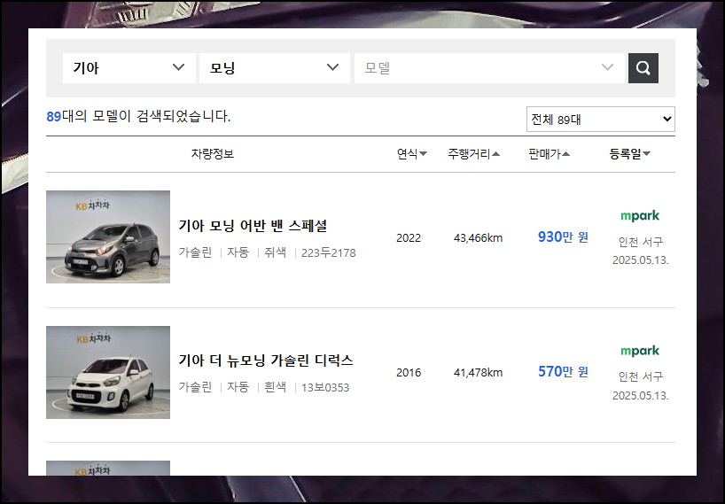 인기 모델인 기아 모닝을 조회해 보았어요. 차량 스펙, 연식, 판매 가격, 주행거리, 사진이 포함된 차량 정보를 리스트로 확인할 수 있는데요. 여기에서 등록일을 살펴보아주세요.