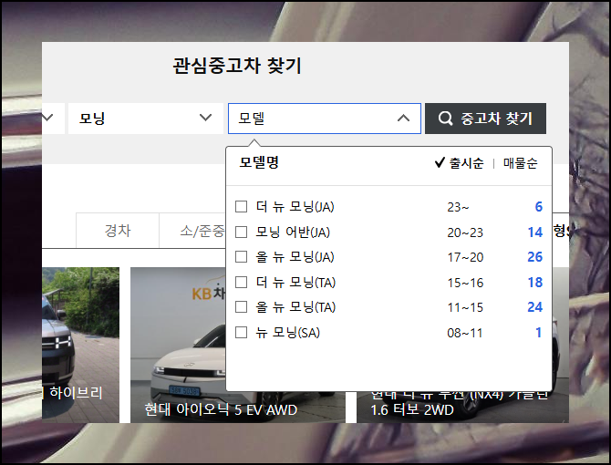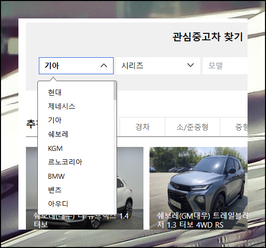 시세를 파악하기 위해서는 먼저 찾고 싶은 차량을 선택해야 해요. 브랜드부터 시작해 시리즈명, 모델명까지 순차적으로 고르세요.