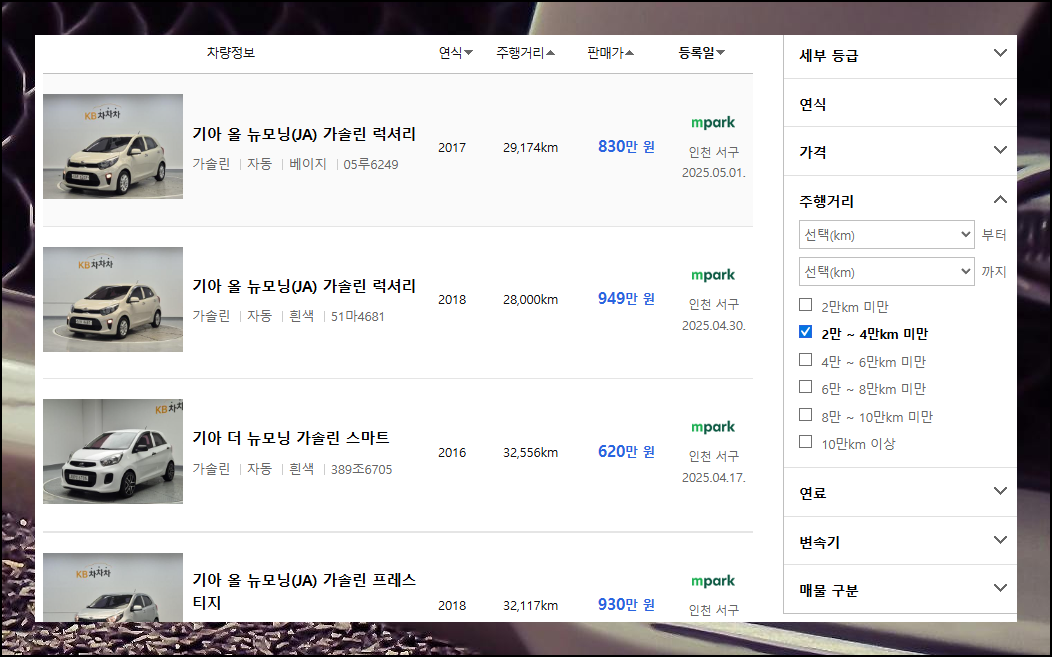 예를 들어, 2만km에서 4만km 미만의 주행거리를 가진 중고차 매물만 필터링하면 유사한 상태에서의 합리적인 시세표 확인 및 비교가 가능합니다.