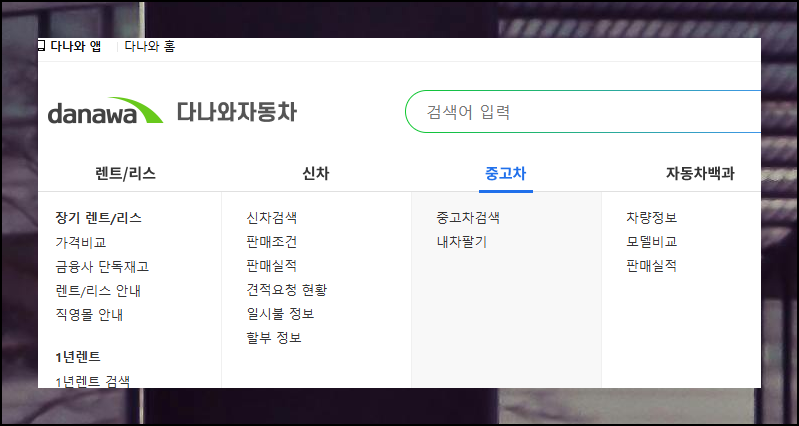 사이트에 접속하면 아시겠지만, 다양한 차량 관련 서비스를 제공하고 있어요. 렌트, 리스 비용 비교부터 신차 견적, 내 차 판매까지 다양한 메뉴가 보이는데요.