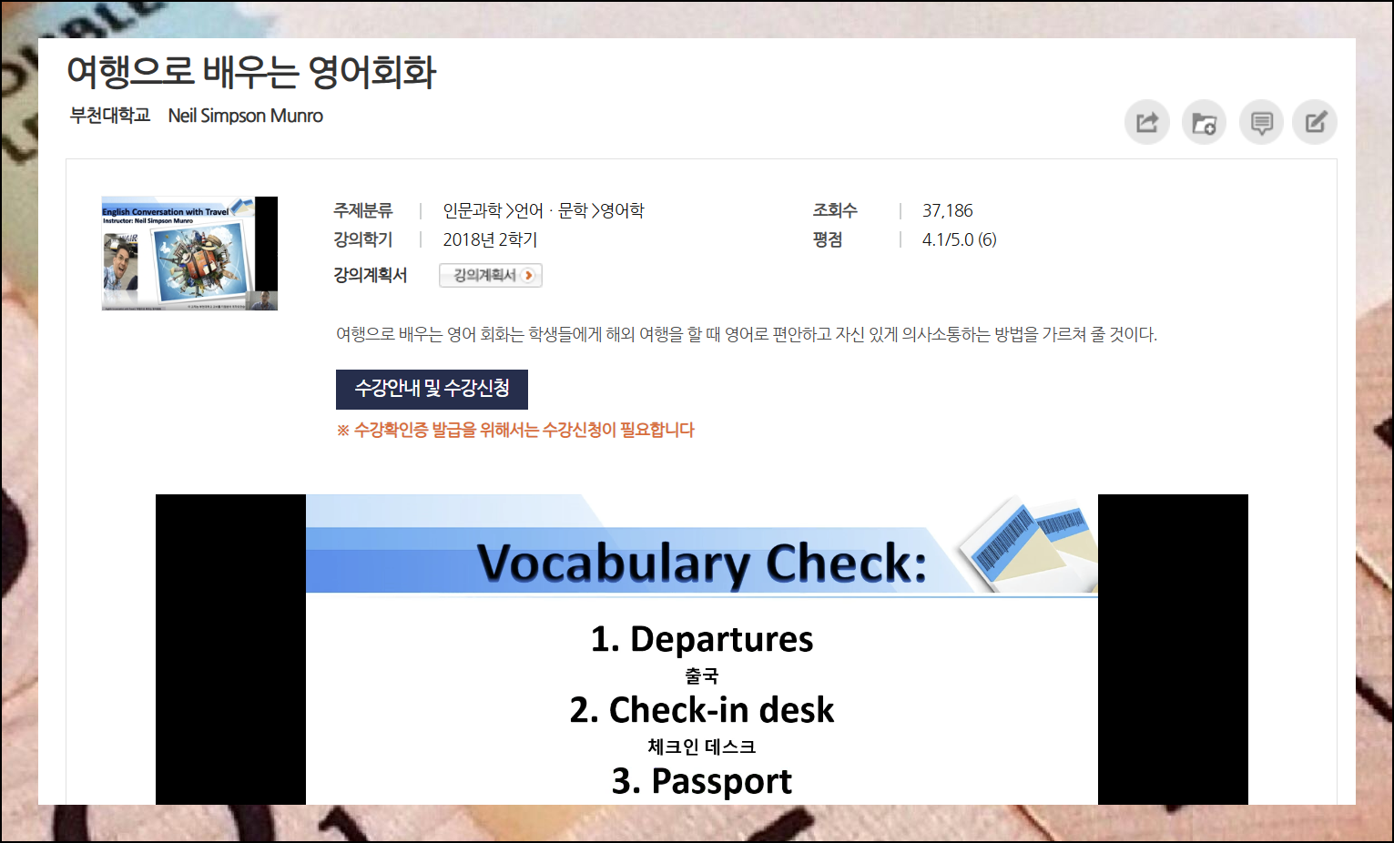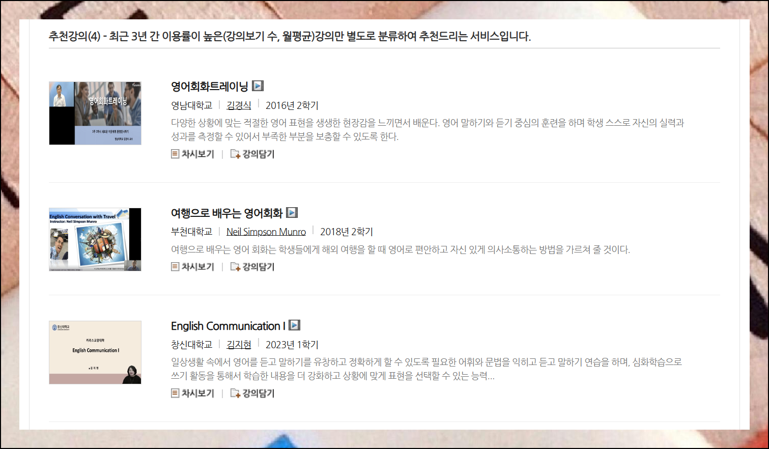 처음 KOCW를 이용하는 분들은 이 부분에서 시작하는 것이 가장 효과적입니다. 다른 학습자들이 이미 검증한 영어회화 강의이기 때문에 품질이 보장되어 있어요.