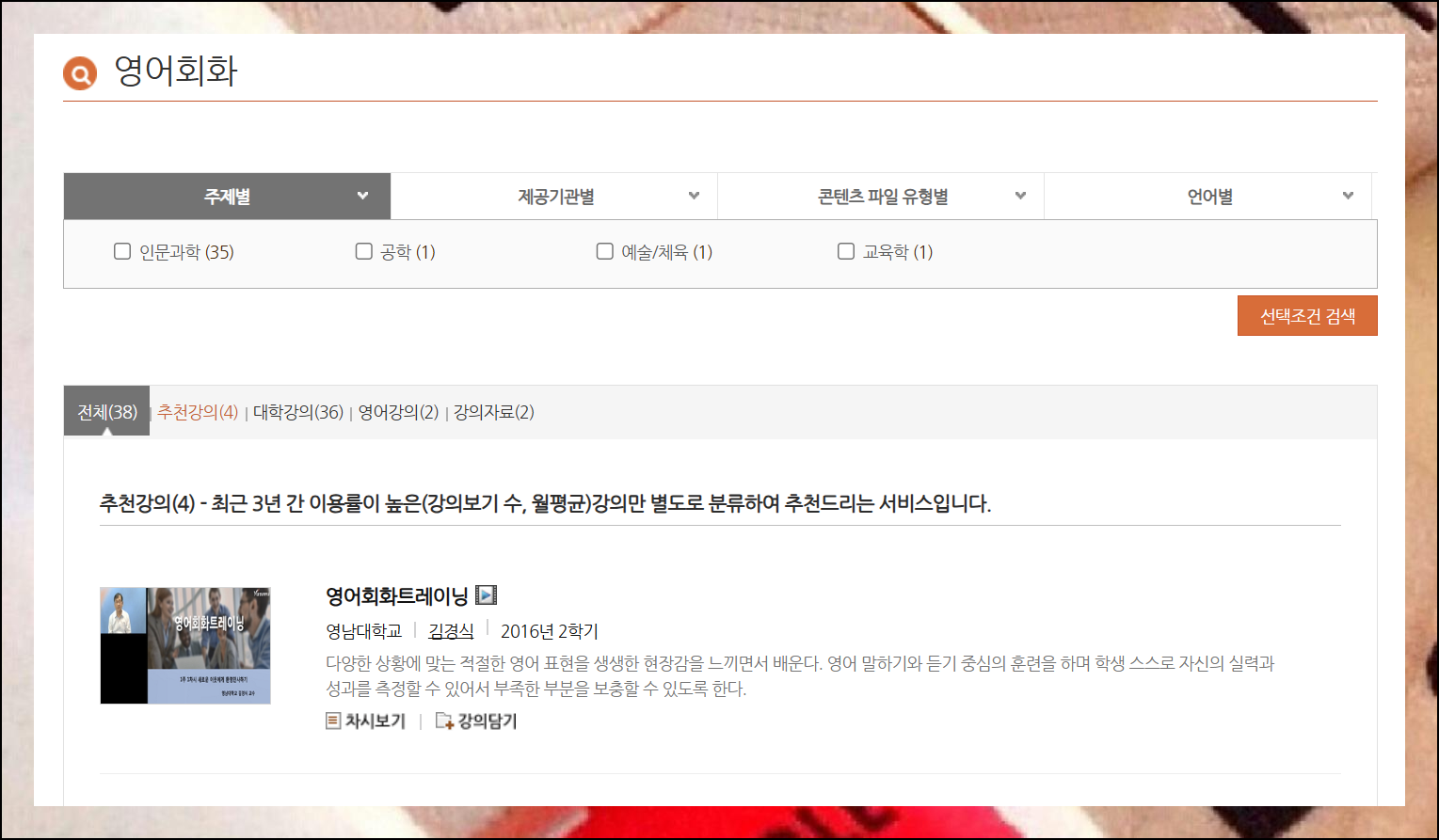 사이트에서 영어회화를 검색하면 추천강의, 대학강좌, 영어교육, 학습자료와 같이 여러 카테고리로 분류되어 있어요. 이 모든 콘텐츠가 무료로 제공된다는 점이 정말 매력적입니다.