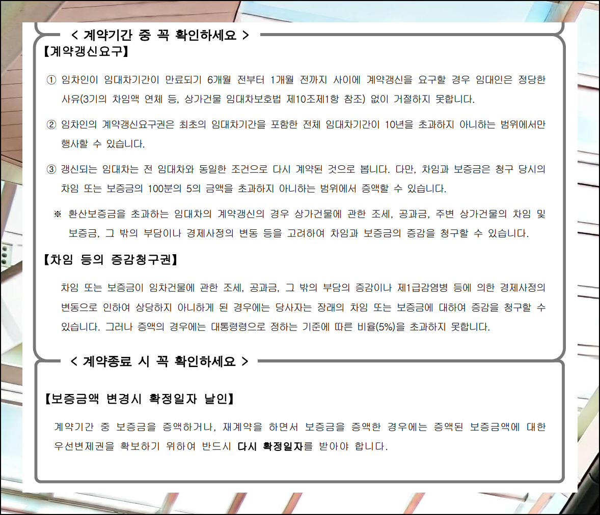 문서 마지막에는 임대차 과정에서 확인해야 할 중요 항목들이 정리되어 있어요. 갱신요구권, 차임 증감청구권, 보증금 변경 시 확정일자 날인 등 생소한 내용이 나오는데요.