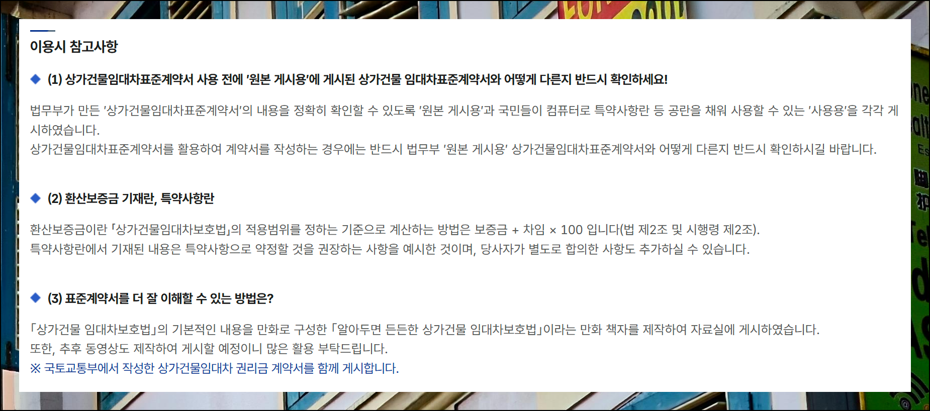 표준 임대차 문서에는 환산보증금 기재란과 특약사항란이 포함되어 있습니다. 또한 상가 계약서 작성에 도움을 주는 만화 가이드북도 무료양식과 함께 제공돼요.