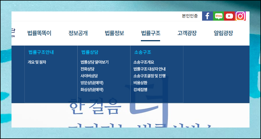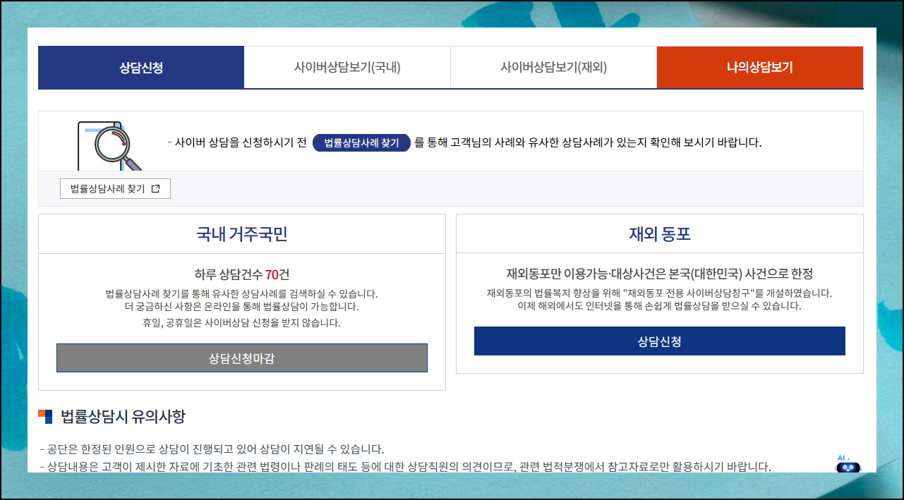 "대한법률구조공단" 사이트에 접속하여 메뉴에 있는 사이버 상담을 선택해 보세요. 바로 신청이 가능합니다. 자문 방법은 온라인, 전화 통화, 직접 방문과 같이 여러 가지 방식으로 이용이 가능한데요.