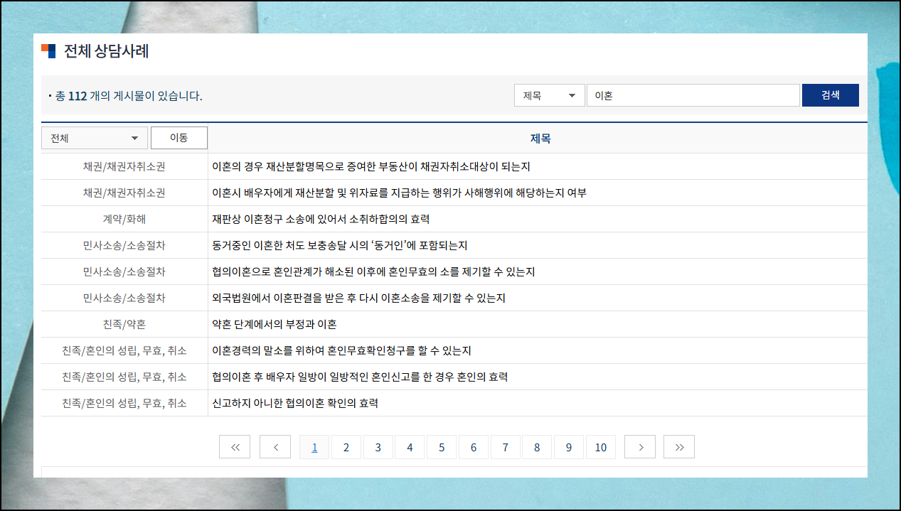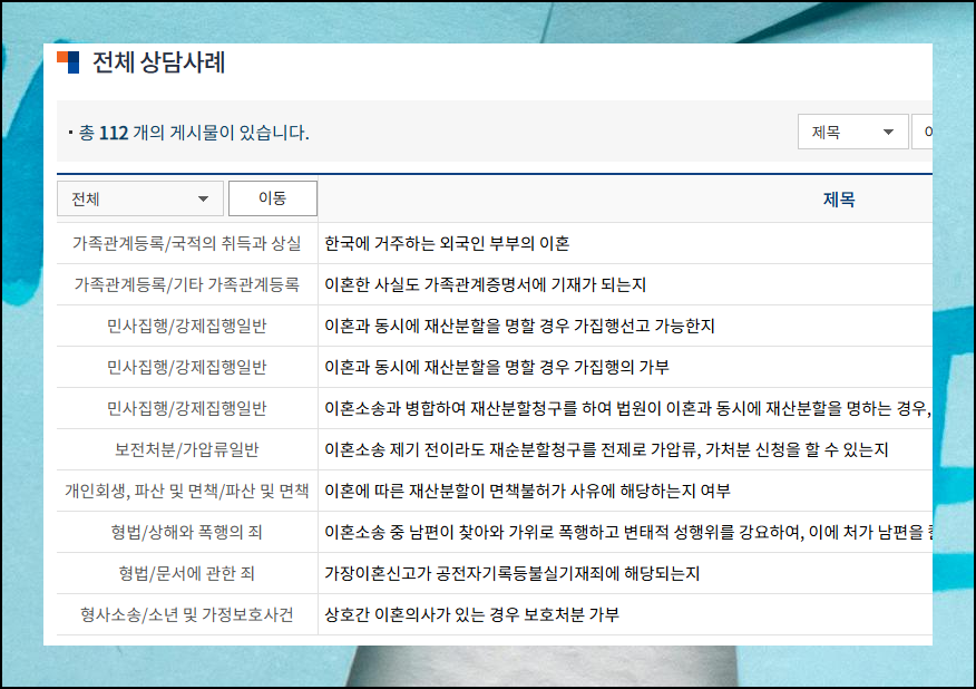 지난 1년간 축적된 사례가 5000건을 넘어서고 있어요. "이혼"을 검색해보니 112개의 케이스를 찾을 수 있었습니다. 변호사 비용을 지출하기 전 단계에서 참고하면 큰 도움이 될 거예요.
