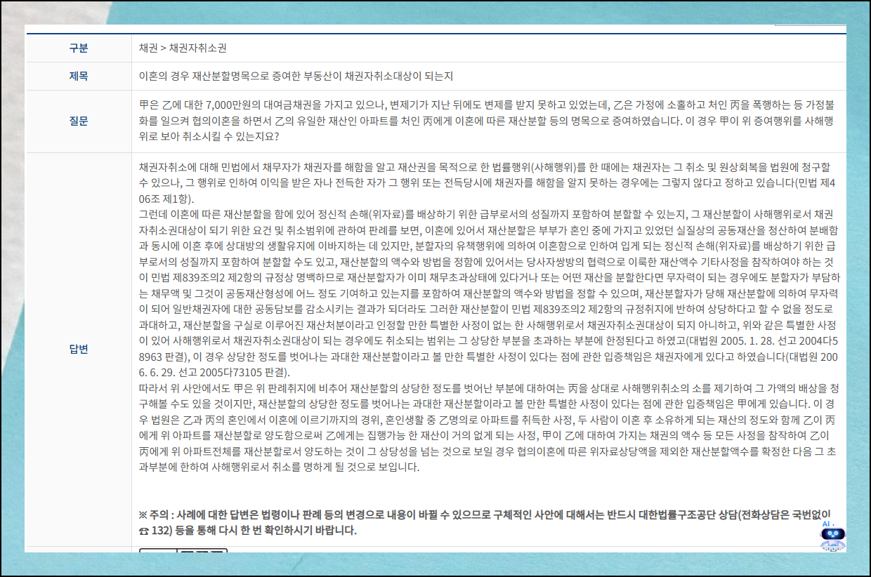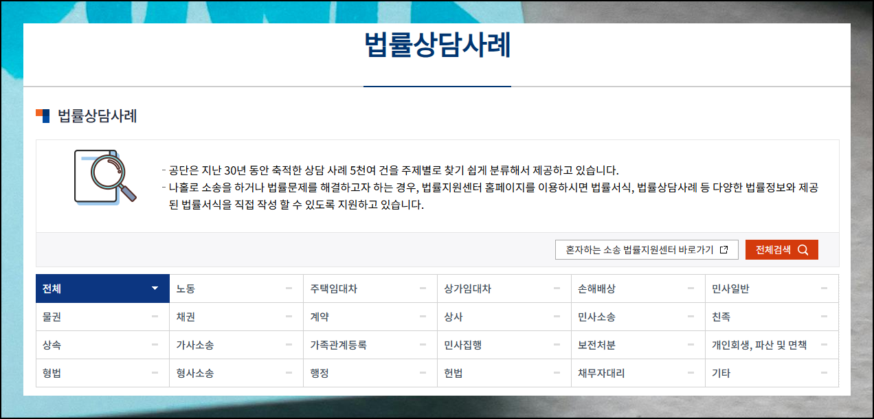 변호사 사무실을 이용했을 때와 비교했을 때 서비스 품질이 약간 다를 수는 있지만, 무료라는 큰 메리트가 있죠. 여러 가지 사례도 제공하고 있어서 신속하게 알아보기에 정말 좋습니다.