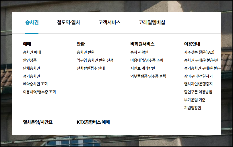 예약 시스템과 검색 기능이 하나로 연결되어 있어서 별도의 사이트를 오갈 필요가 없습니다. 가장 기본적인 방법을 알려드릴테니 사이트 접속 후 "승차권 예매" 메뉴를 눌러주세요.