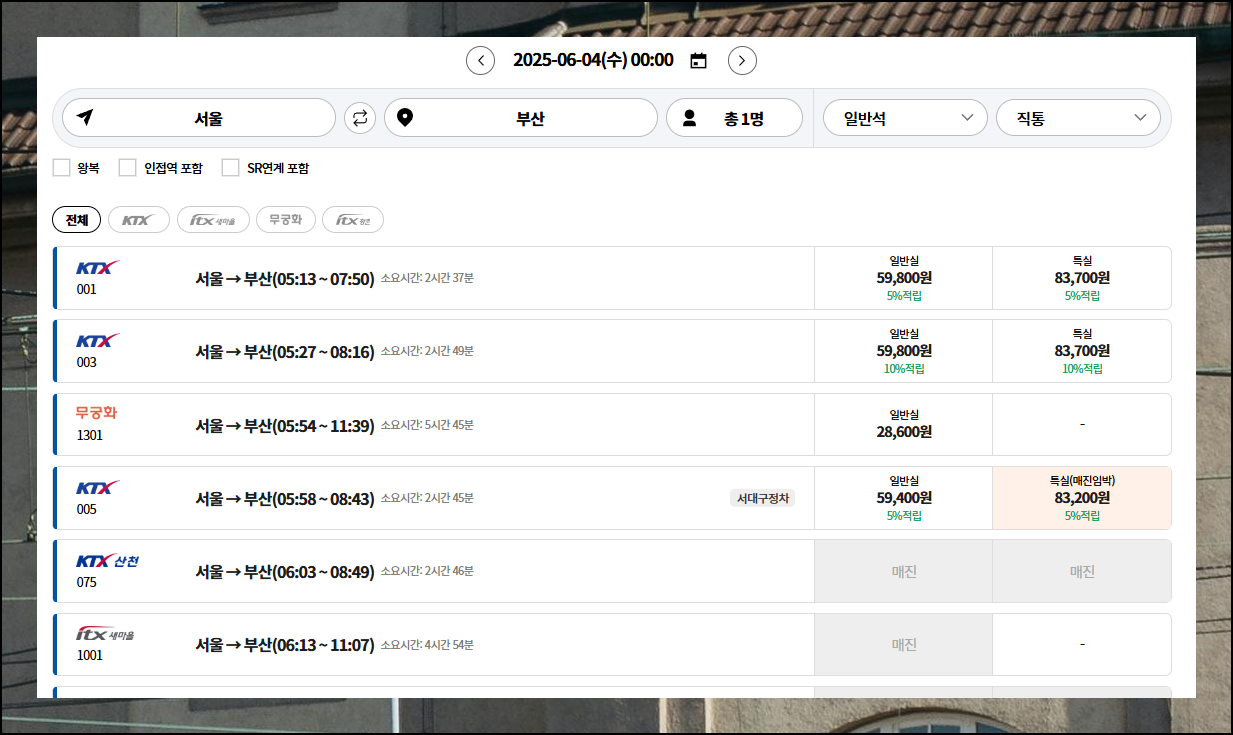 예매 페이지에 보면 출발 도시와 목적지을 입력하도록 되어 있는데요. 여기에 더하여 일정 및 인원을 선택한 후 "열차 조회" 버튼을 클릭해 보세요. 그럼 해당 구간의 모든 열차가 표시됩니다.