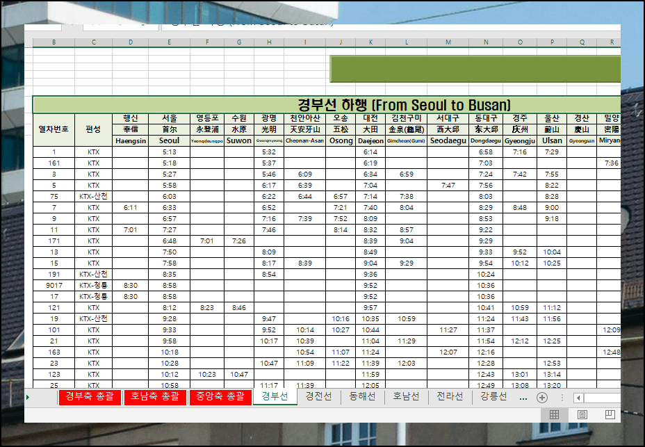 저장한 파일에는 주요 철도 구간의 상세한 운행표가 들어있어요. 경부선 기준으로 보면 서울 출발부터 부산 도착까지 각 도시별 정차 시각을 정확히 확인할 수 있습니다. 이것을 통해 오차 없는 여행일정 관리가 가능해요.