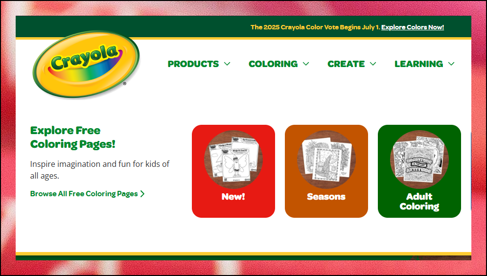 가장 먼저 소개할 무료 컬러링북 다운로드 사이트는 crayoia예요. 번거로운 회원가입 과정 없이 바로 원하는 자료를 받아볼 수 있는 곳입니다.