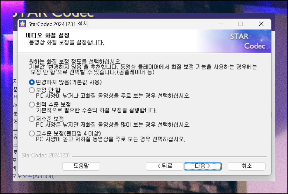 곰플레이어와의 최적 호환성을 위해 화질 자동 보정 기능은 비활성화하는 것을 추천해요. 마지막 단계에서 추가 프로그램 옵션이 나오는데, 정말 필요한 것들만 선별해서 설치를 진행하시길 바랍니다.