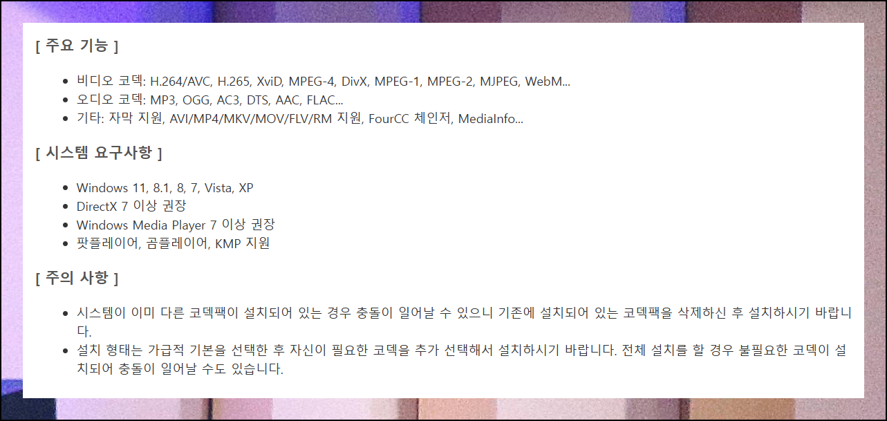 성능이 제한적인 구형 컴퓨터를 사용한다면 라이트 버전을 선택하는 게 현명해요. 자신의 시스템 사양에 알맞은 통합코덱 버전을 설치하는 것이 좋습니다.