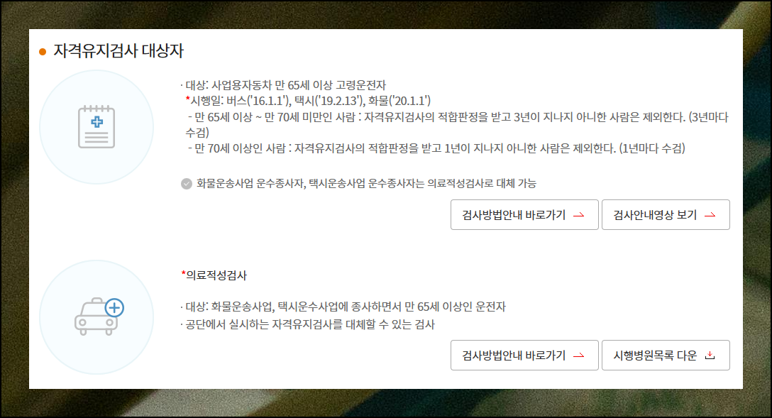 사업용 차량을 운전하는 만 65세 이상 고령자가 받아야 하는 테스트예요. 연령에 따라 평가 주기가 다르게 적용이 됩니다. 65세부터 70세 전까지는 3년에 한 번씩 받으면 충분해요.
