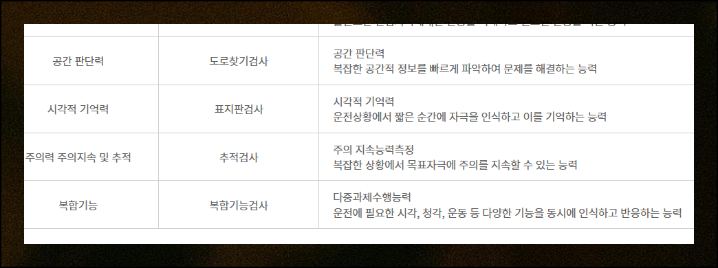 실전 상황을 반영한 나머지 4개 항목도 중요해요. 목적지까지 가는 길을 찾는 능력, 도로 표지판 내용을 얼마나 잘 기억하는지, 다른 차에 사람이 타고 있는지 구별하기, 여러 작업을 한꺼번에 처리하는 복합 기능까지 확인합니다.