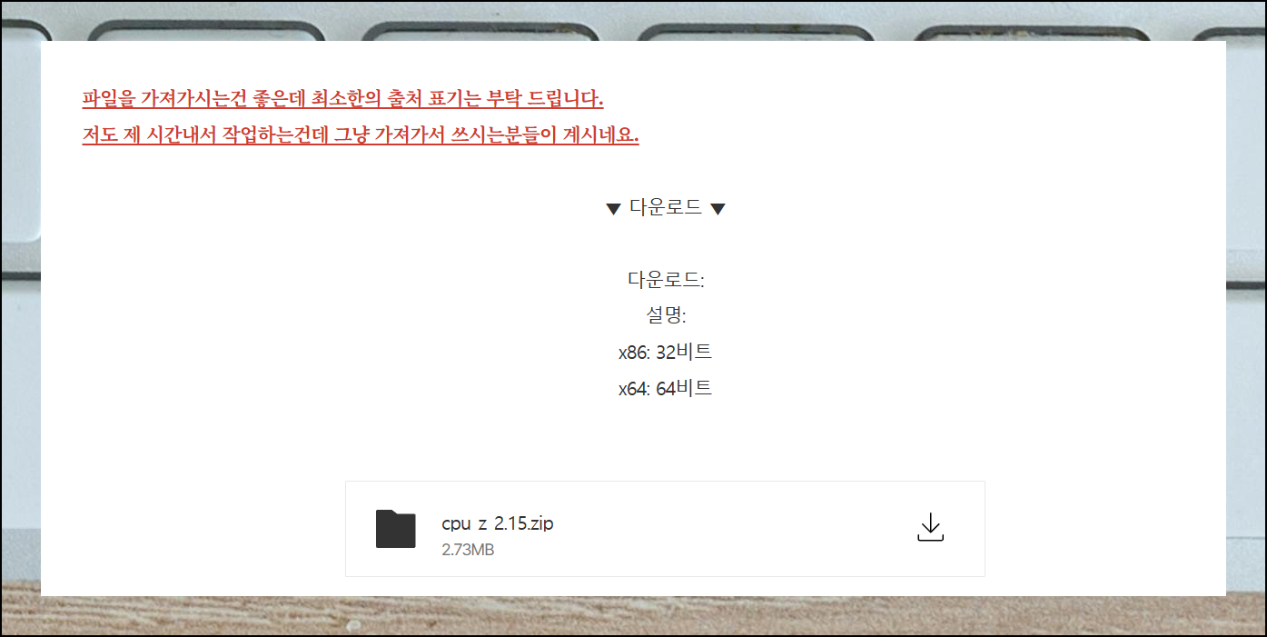 원하시는 CPU-Z 한글판 게시물을 클릭해보세요. 그러면 다운로드 선택지가 여러 형태로 나뉘어서 표시됩니다. 설치 방식과 포터블 버전을 골라서 받을 수 있었는데요. 이번에 올라온 것은 한 가지 버전으로 되어 있고, 운영체제에 따라서 골라서 사용할 수 있도록 되어 있습니다.