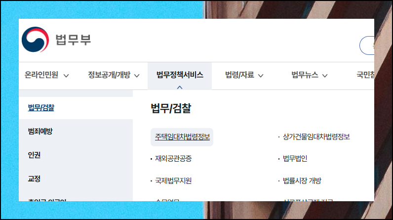 법무부 사이트에 접속했습니다. 여기에 접속하면 다양한 서비스 메뉴를 확인할 수 있어요. 처음에 법무정책서비스 항목을 클릭하고, 이후 법무 및 검찰 카테고리를 살펴보면 됩니다. 원하는 자료를 찾아가기 어렵지 않아요.