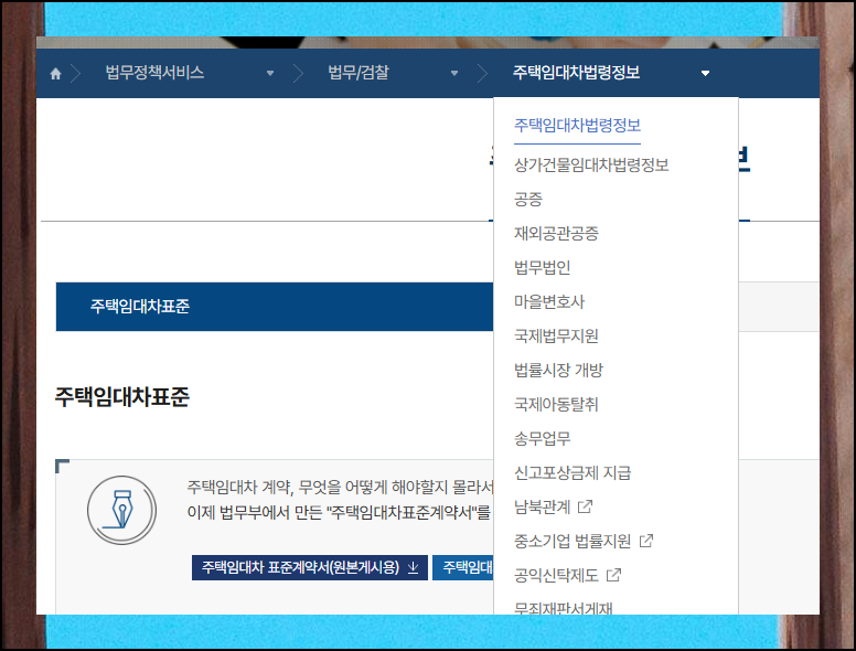 법무정책서비스 페이지에서는 건물 종류에 따라 서로 다른 양식을 제공하고 있어요. 주거용 건물인 아파트나 빌라의 경우 [주택 임대차 법령정보] 메뉴를 추가로 선택하면 됩니다. 상업용 건물을 임대하는 경우에는 [상가건물 임대차 법령정보]를 선택해 주세요. 각 서비스마다 무료 이용이 가능한 전세계약서 양식 파일이 준비되어 있습니다.