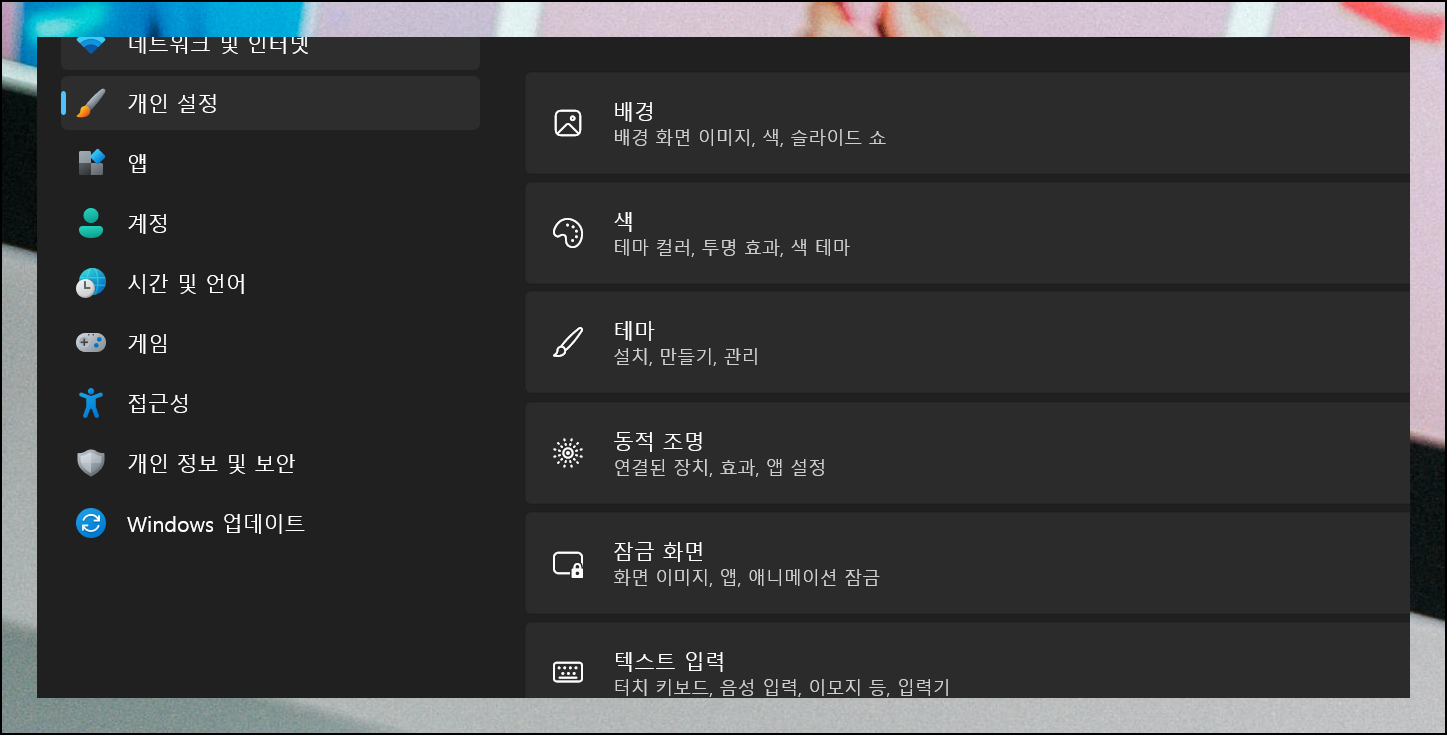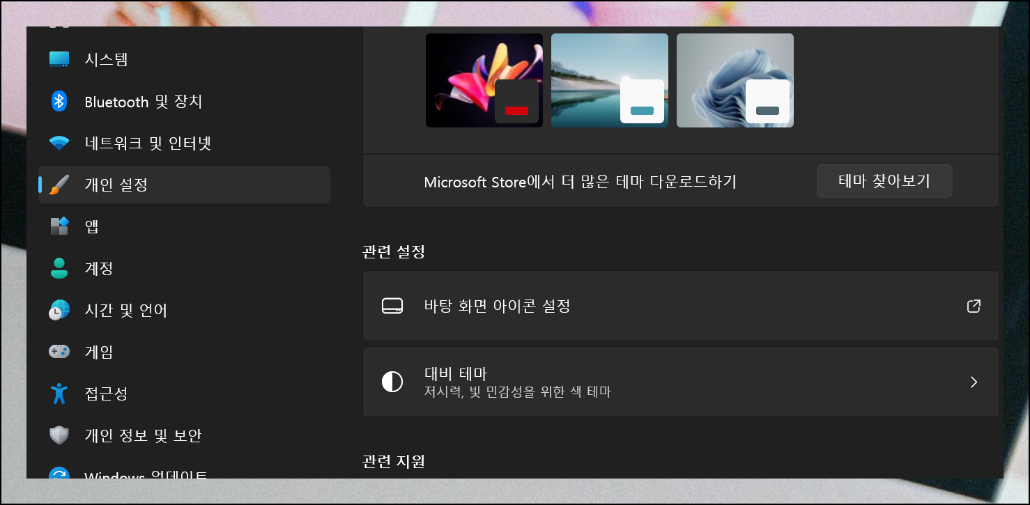 "아이콘이 갑자기 사라졌어요" 문제는 생각보다 자주 일어나는 일이에요. 이런 상황에 대비해서 개인 설정 화면을 미리 알아두면 유용합니다. 개인 설정에서는 배경뿐만 아니라 윈도우 디자인과 관련된 다양한 옵션들을 조정할 수 있어요. 테마 메뉴를 찾아서 클릭해주세요.