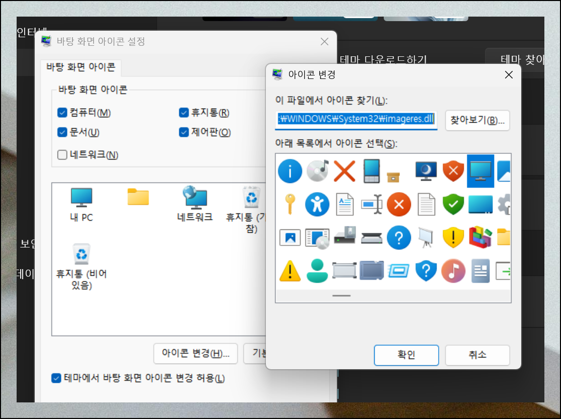 모든 바탕화면 아이콘이 갑자기 사라졌다고 해서 너무 당황하지 마세요. 문제 해결과 함께 다양한 테마로 컴퓨터를 새롭게 꾸밀 기회이기도 합니다. 창의 하단이나 우측 부분을 살펴보면 원하는 설정을 할 수 있어요. "바탕화면 아이콘 설정" 메뉴를 찾아보세요.