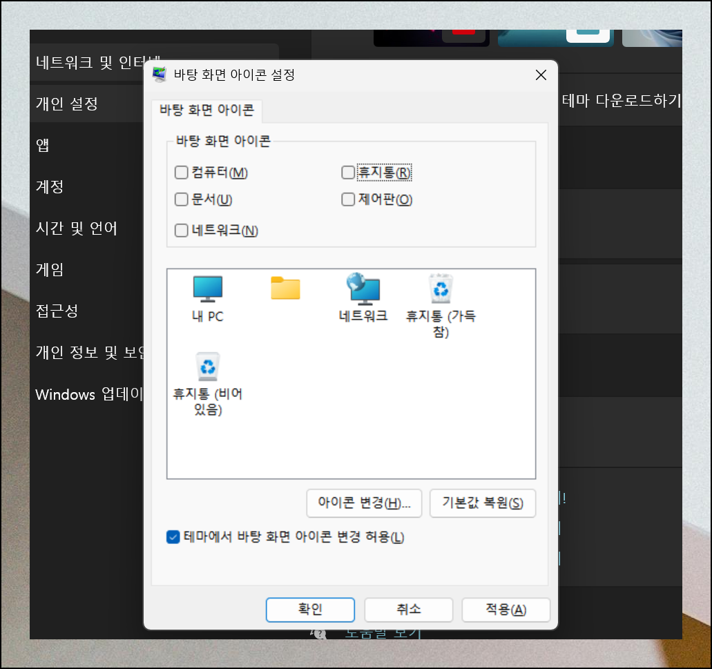 이 단계에서 "바탕화면 아이콘이 사라졌어요" 문제를 본격적으로 해결할 수 있어요. 자주 사용하는 다섯 가지 항목에 대해 설정할 수 있는데요. 컴퓨터와 휴지통부터 네트워크까지 필요한 것만 선택해서 표시하면 됩니다. 체크박스로 간편하게 켜고 끌 수 있어서 편리해요.