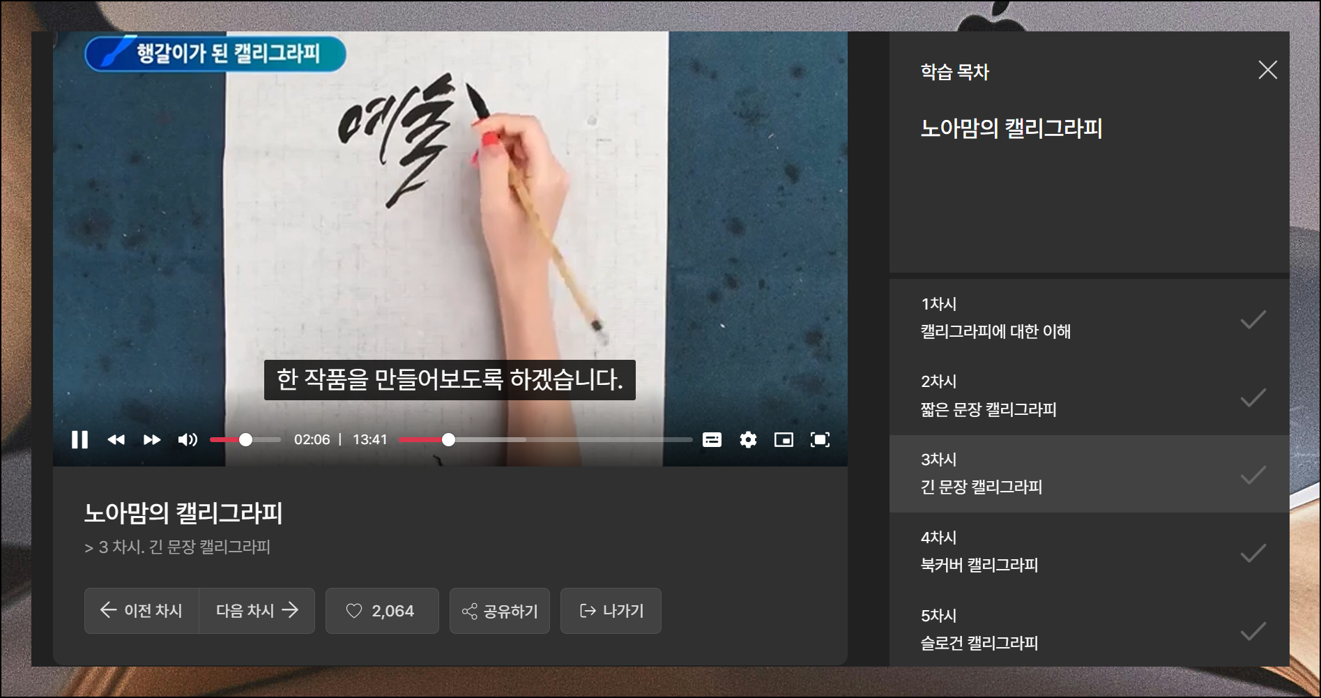 단순히 책으로만 공부하는 것보다 동영상 강의를 시청하는 것이 학습 효과가 훨씬 뛰어나요. 캘리그라피는 특히 손목 동작과 붓놀림을 직접 관찰하면서 배워야 하는 부분이 많기 때문에 영상 학습이 최적입니다. 자막도 함께 제공되어 강사의 설명을 이해하는 데 큰 도움이 돼요.