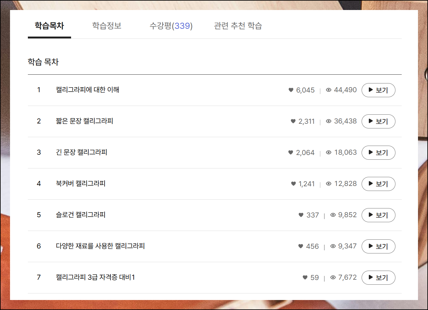 학습 목록을 확인하면 캘리그라피에 대해 어떤 내용을 배우는지 미리 파악할 수 있어요. 기본적인 이해부터 시작해서 짧은 문장, 긴 문장, 북커버, 슬로건 그리기 방법을 배울 수 있습니다. 다양한 재료를 활용한 캘리그라피 기법도 익힐 수 있어요.
