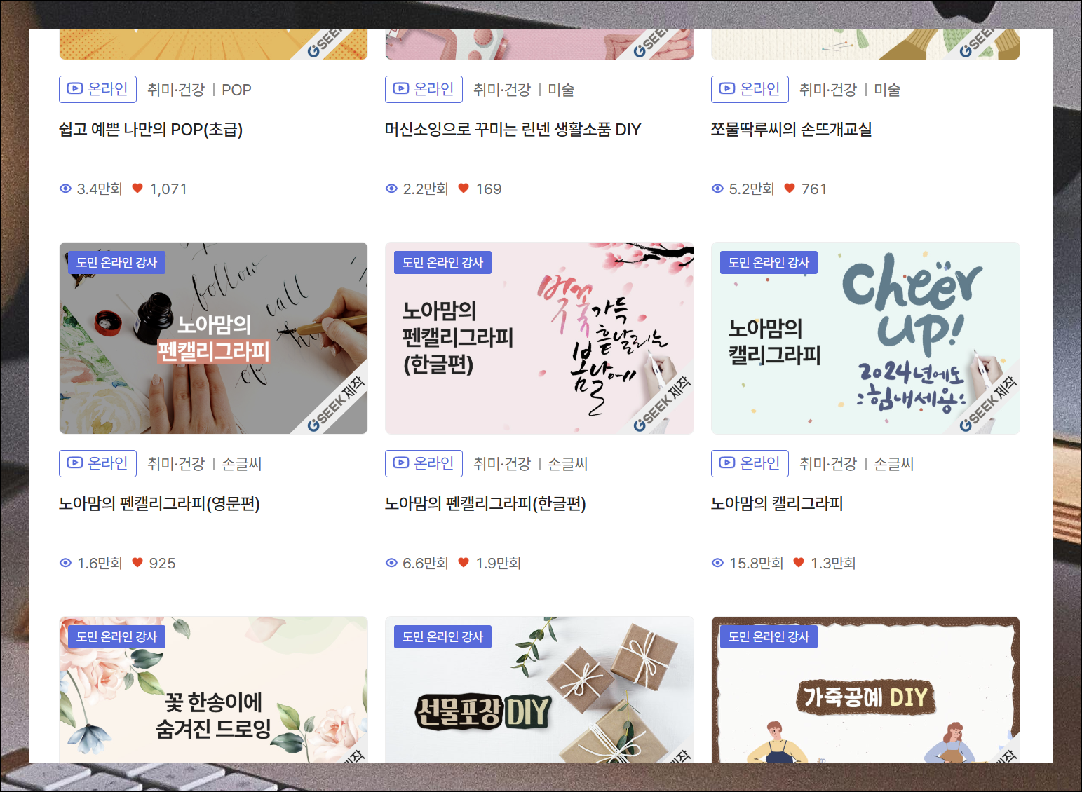 분야별 학습에서 취미생활 카테고리를 선택하면 흥미진진한 무료강좌들이 나타나요. 캘리그라피를 배울 수 있는 강좌도 물론 있어요. 손뜨개, 린넨 생활 소품, POP 등 재미있게 배울 수 있는 강좌들이 풍성하니 함께 살펴보세요.