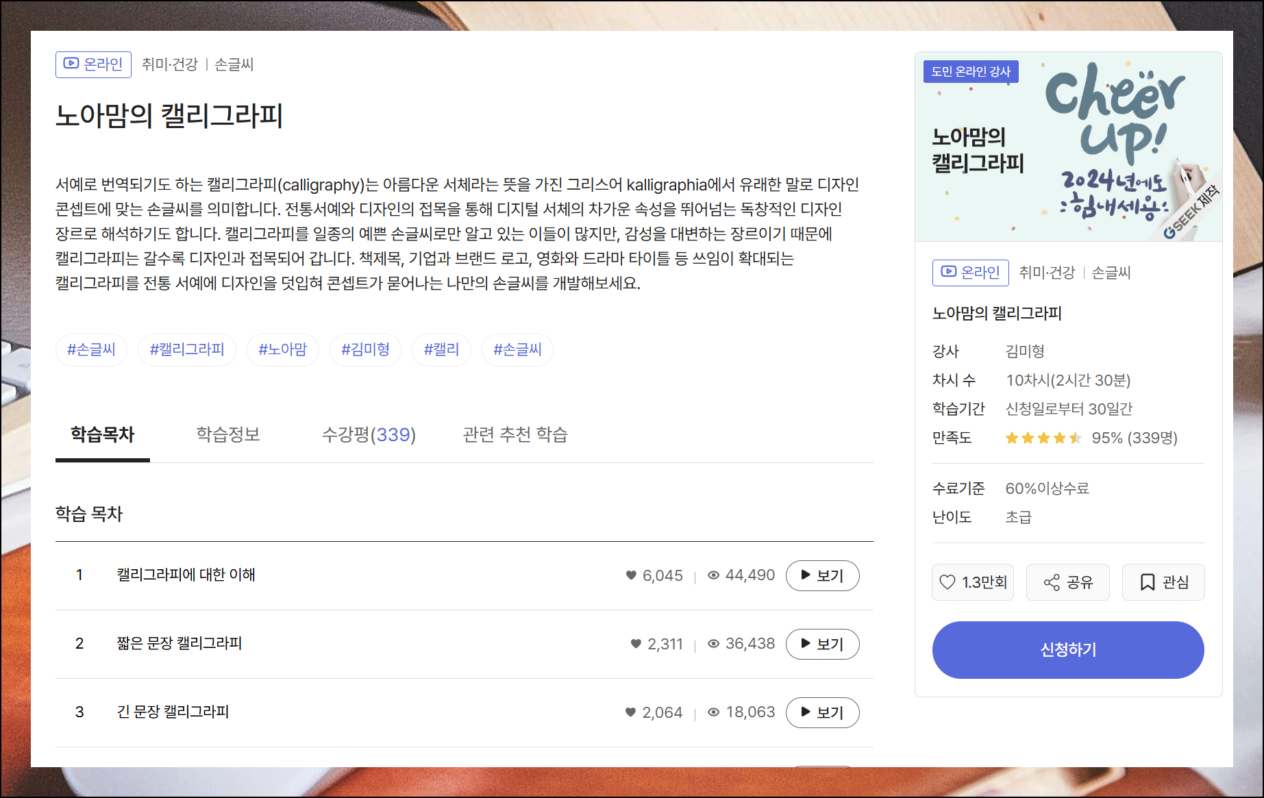 이곳에서 제공하는 캘리그라피 강좌는 여러 가지가 있습니다. 한글편, 영문편, 기본 등 다양한 강의로 구분되어 있어요. 수강 신청 버튼을 누르면 동영상으로 제작된 강의를 바로 시청할 수 있어요. 각각의 특징이 다르니 본인에게 적합한 것을 선택해보세요.