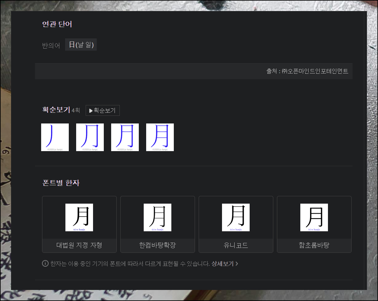 연관 단어로는 날 일이 표시되는군요. 획순보기 기능을 통해 해당 한자를 올바르게 쓰는 순서를 배울 수 있습니다. 이렇게 배우면 다음에 직접 한문 그려서 찾기 진행을 할 때 유용하게 사용할 수 있어요.