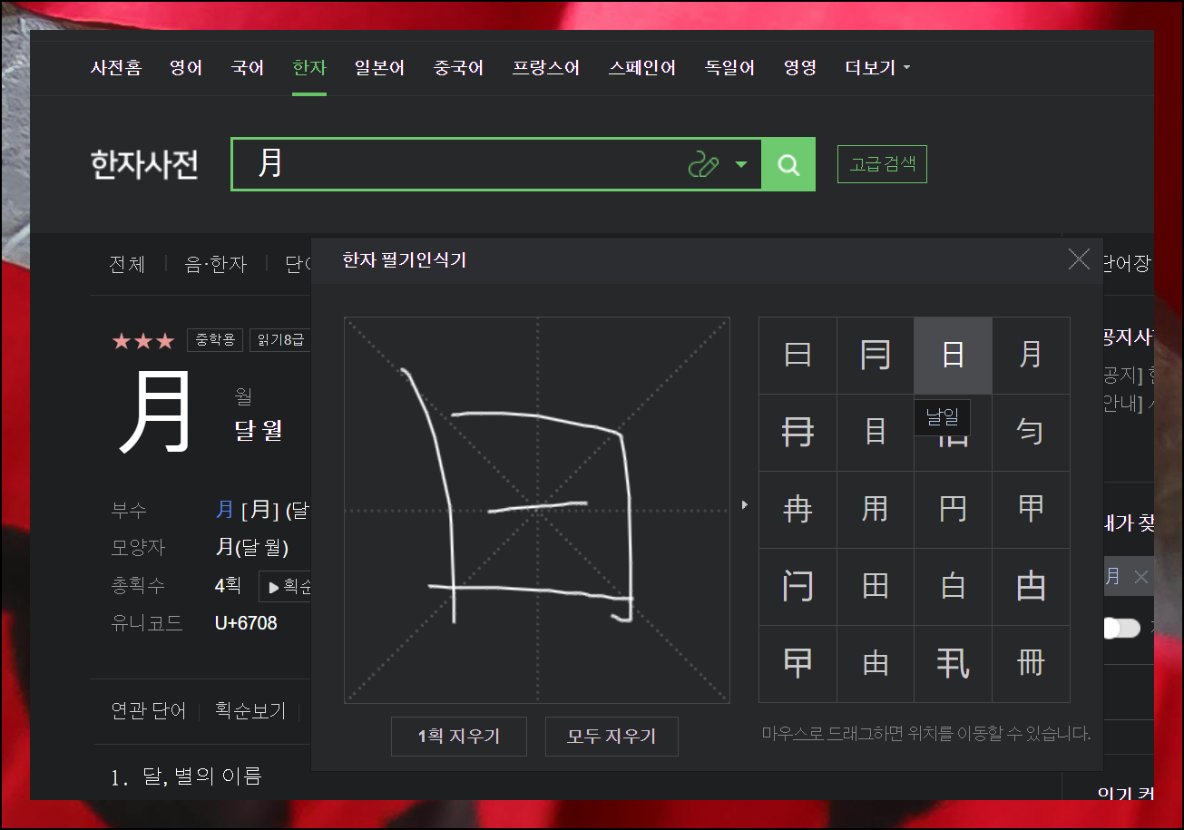 예시로 "달 월"자를 그려보았습니다. 제가 그린 한문과 유사한 모양의 한자들을 여러 개 추천해주고 있어요. 이 중에서 찾으려고 하는 문자를 선택하면 됩니다. 선택하는 순간 검색창에 해당하는 문자가 자동으로 입력이 돼요. 그러면 자동완성 기능이 작동해서 관련된 결과들이 나타납니다.