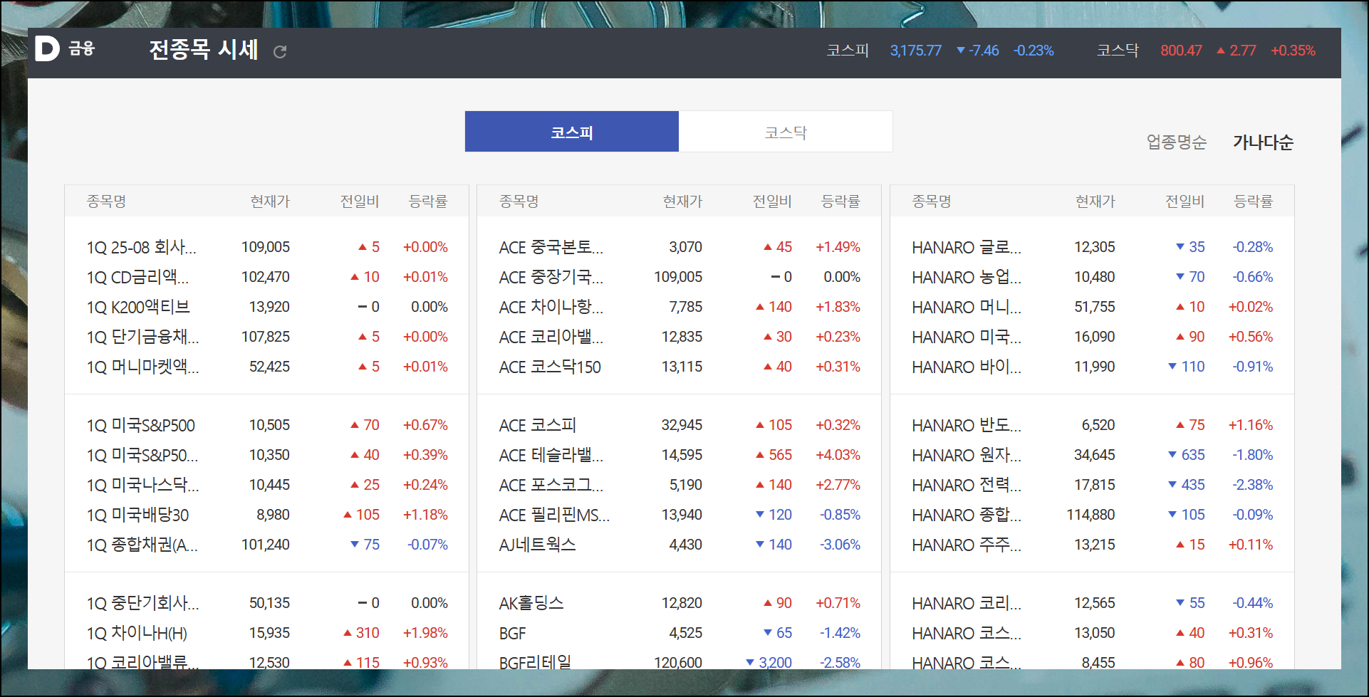 다양한 종목의 주식시세를 동시에 살펴볼 수 있는 화면이 나타나요. 종목명과 현재가, 전일 대비 변동폭, 등락률이 표 형태로 정리되어 있어요. 코스피와 코스닥 상장 기업들이 모두 포함되어 있습니다. 가나다 순서로 배열되어 있어서 원하는 종목을 빠르게 찾을 수 있어요.