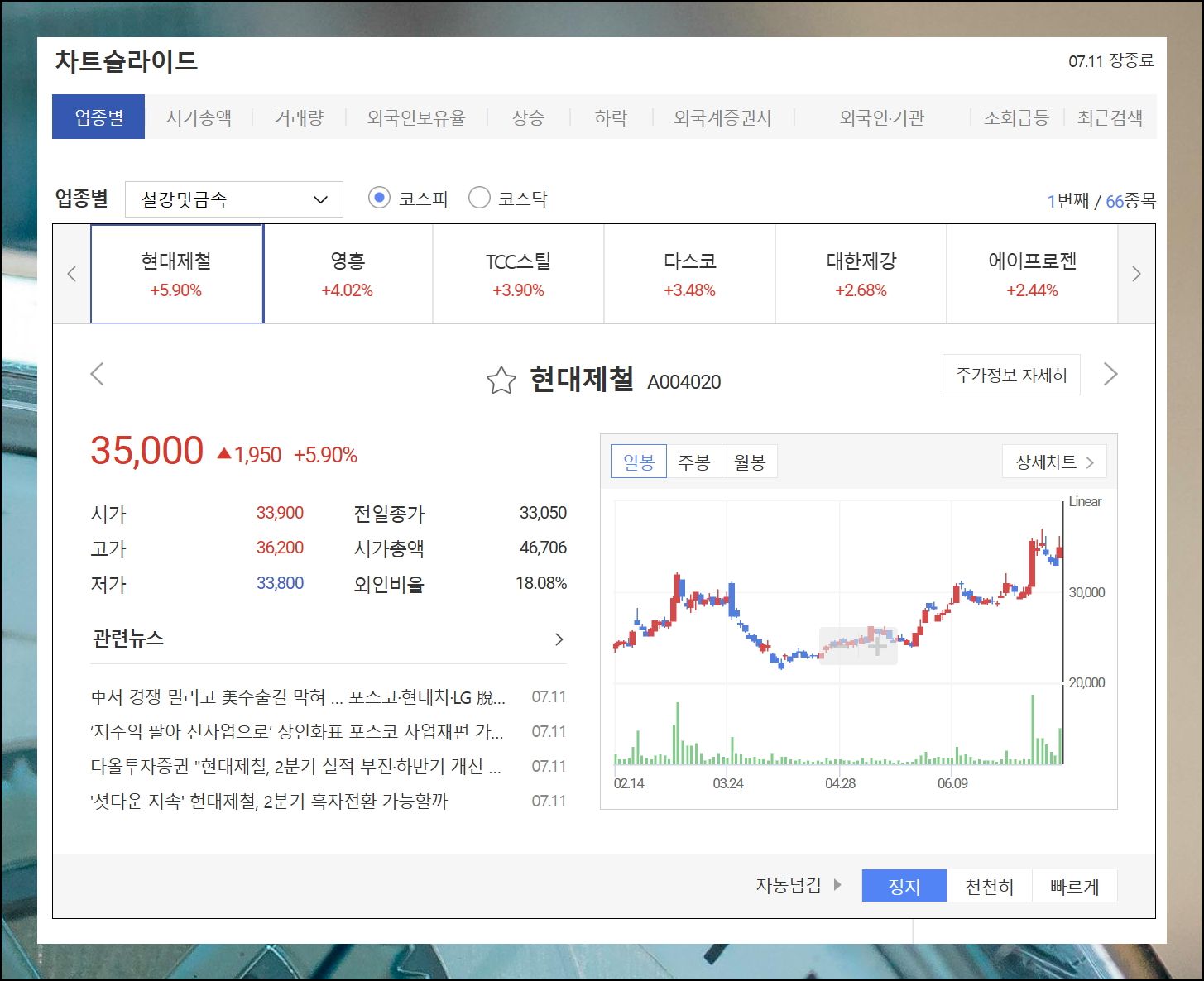 목록에서 차트슬라이드 버튼을 선택해보세요. 선택한 업종에 속한 회사의 주식시세를 각각 조회하는 게 가능해요. 설정된 시간 간격에 따라 자동으로 회사가 바뀌면서 다양한 지표와 차트, 관련 뉴스를 보여줍니다. 여러 종목을 편리하게 비교 분석할 수 있는 기능이에요.