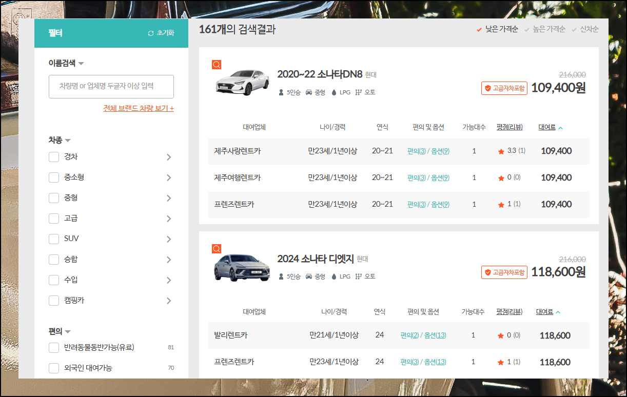 검색하면 161대라는 엄청난 수의 차량 옵션이 나타나요. 동일한 차종이라도 업체에 따라 가격과 서비스가 천차만별입니다. 요금표를 차근차근 살펴보면 자신의 여행 패턴과 예산에 최적화된 옵션을 발견할 수 있어요.
