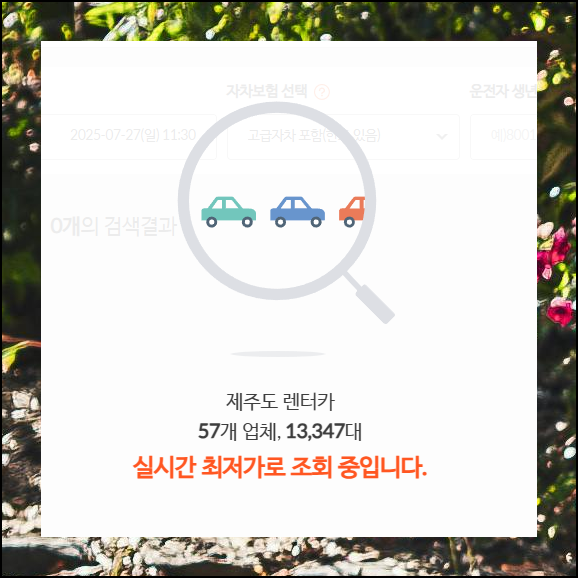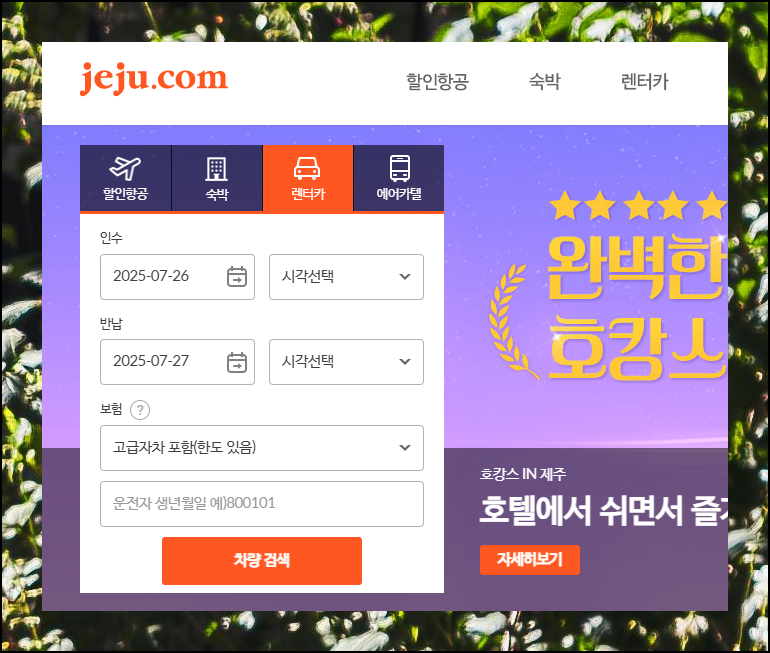 홈페이지에서 렌트카 섹션을 선택하면 날짜와 시간을 입력하는 화면이 뜹니다. 본인의 제주 여행 스케줄에 맞춰서 대여 기간을 설정하고 검색만 하면 돼요. 클릭 몇 번으로 원하는 모든 정보와 요금표를 확인할 수 있습니다.