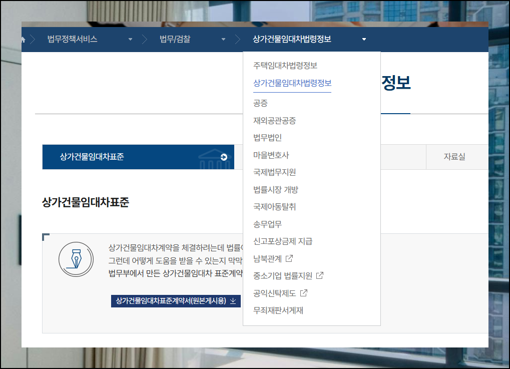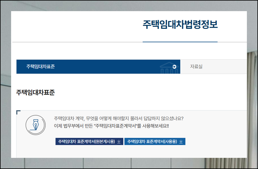 새로운 화면으로 이동하면 두 개의 옵션을 확인할 수 있습니다. 아파트나 빌라 임대를 계획하고 계신 분들은 주택 임대차 법령정보를 클릭하시면 되고요. 이곳에서 부동산 월세 계약서 무료 양식을 받아보실 수 있어요. 상가 임대를 고려하시는 분들은 상가건물 임대차 법령정보를 선택하시면 됩니다.