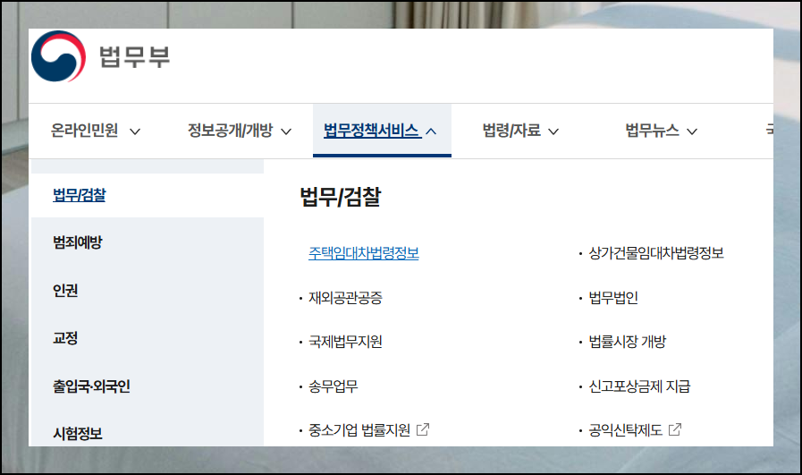 법무부 홈페이지는 다양한 서비스와 유익한 자료들을 제공하고 있어요. 부동산 월세 계약서 무료 양식을 찾으시려면 법무정책서비스 메뉴를 먼저 클릭하세요. 이어서 "법무 / 검찰" 항목을 순차적으로 선택하시면 됩니다. 메뉴 구성이 이해하기 쉽게 되어 있어서 처음 방문하는 분들도 어렵지 않게 찾아갈 수 있어요.