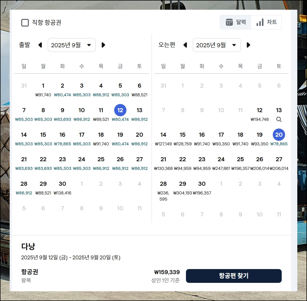 화면에 나타난 날짜별 베트남 항공권 가격이 표시된 달력을 살펴보세요. 표시된 금액이 낮을수록 저렴한 날짜를 의미합니다. 예시로 보면 9월 12일에 출발해서 20일에 돌아오는 일정의 왕복 항공료가 159,339원으로 나오는데요. 해당 날짜를 이용하면 싸게 구입하는 것이 가능합니다.