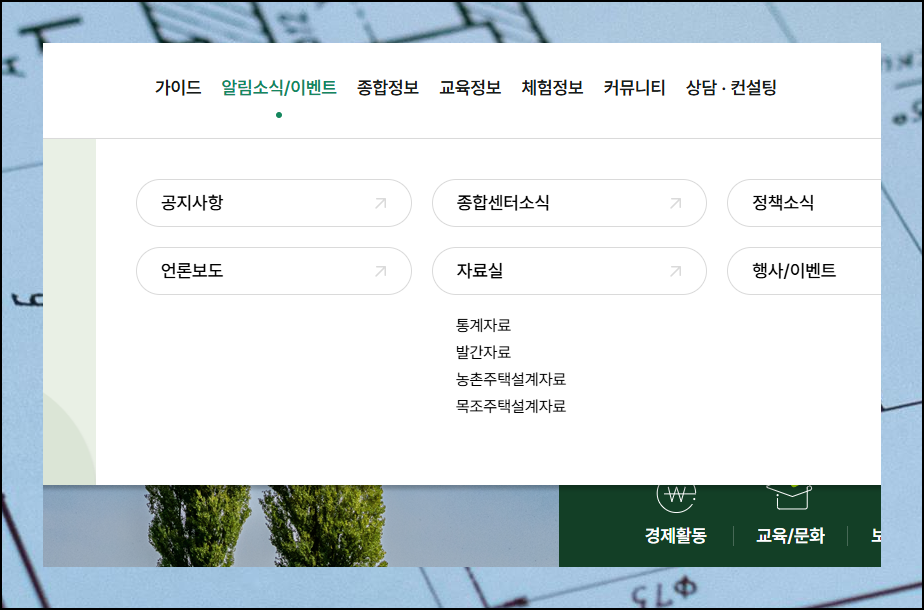 그린대로 사이트에서는 설계도면 제공 외에도 다양한 서비스를 운영하고 있어요. 전문가 상담부터 실무 교육, 정책 지원까지 전원생활에 필요한 모든 정보가 한 곳에 모여 있습니다. 메뉴에서 "알림소식 및 이벤트"를 클릭하면 전원주택 관련 자료실을 찾을 수 있어요.
