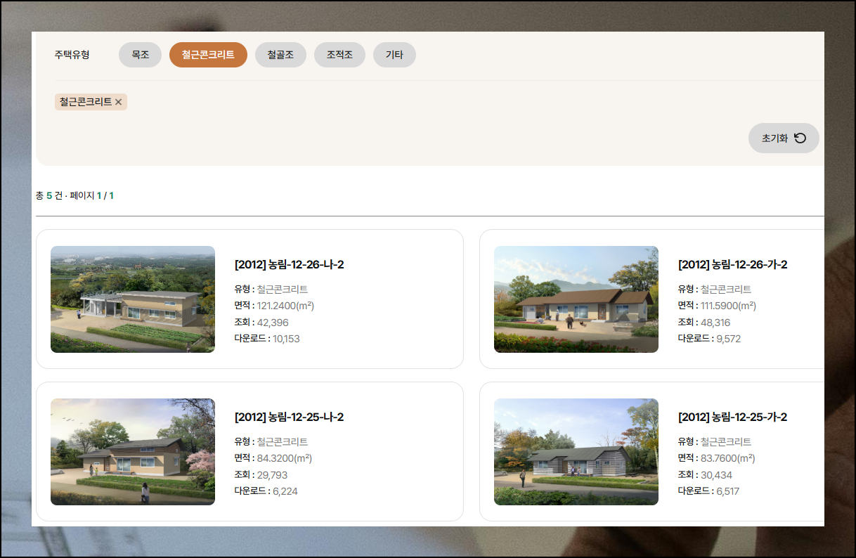 화면을 아래로 내려보면 선택 가능한 전원주택 설계도면이 정말 다양해요. 수십 가지가 넘는 옵션 중에서 집의 크기나 원하는 스타일에 맞는 것을 골라볼 수 있습니다. 목조주택부터 철근콘크리트, 철골조, 조적조까지 시공 재료별로도 세분화되어 있어요.
