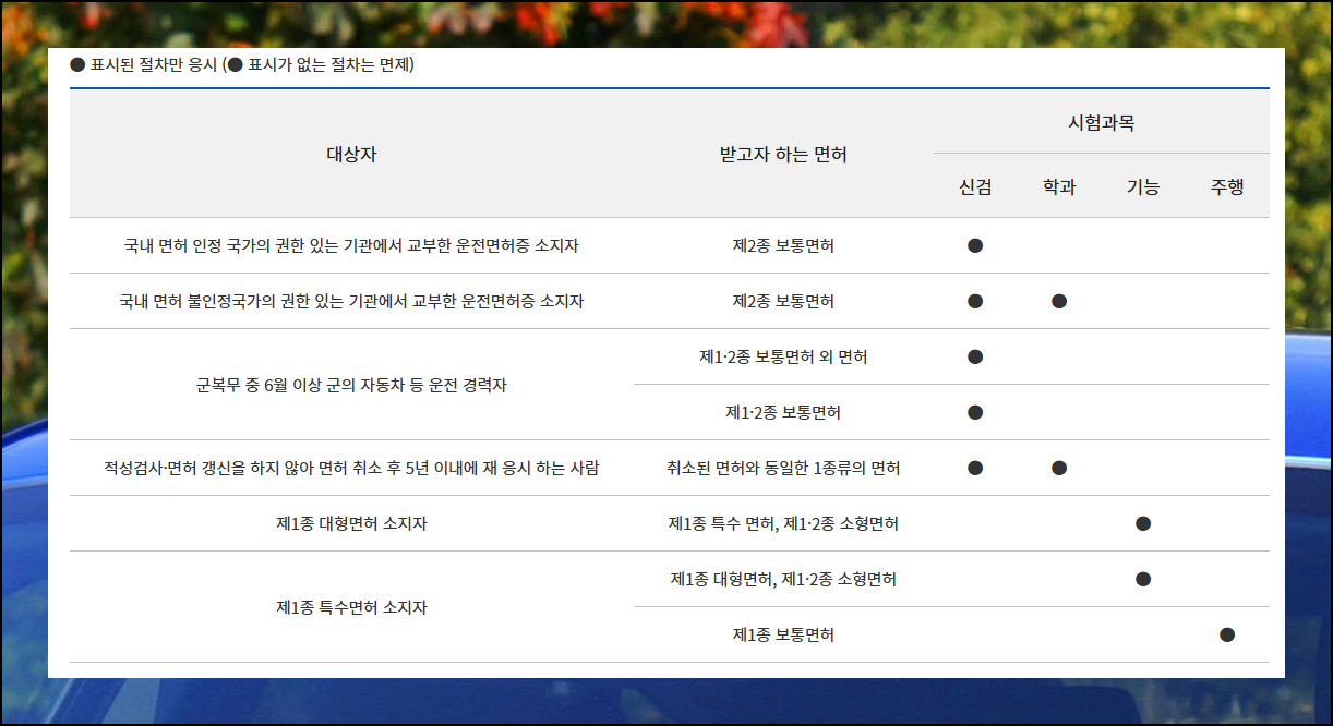 일정 조건을 만족하면 1종보통면허를 취득하는 시험에서 일부 과목 면제를 받을 수 있어요. 특수면허를 소유한 분들은 보통면허 취득 시 주행시험만 응시하면 됩니다.
