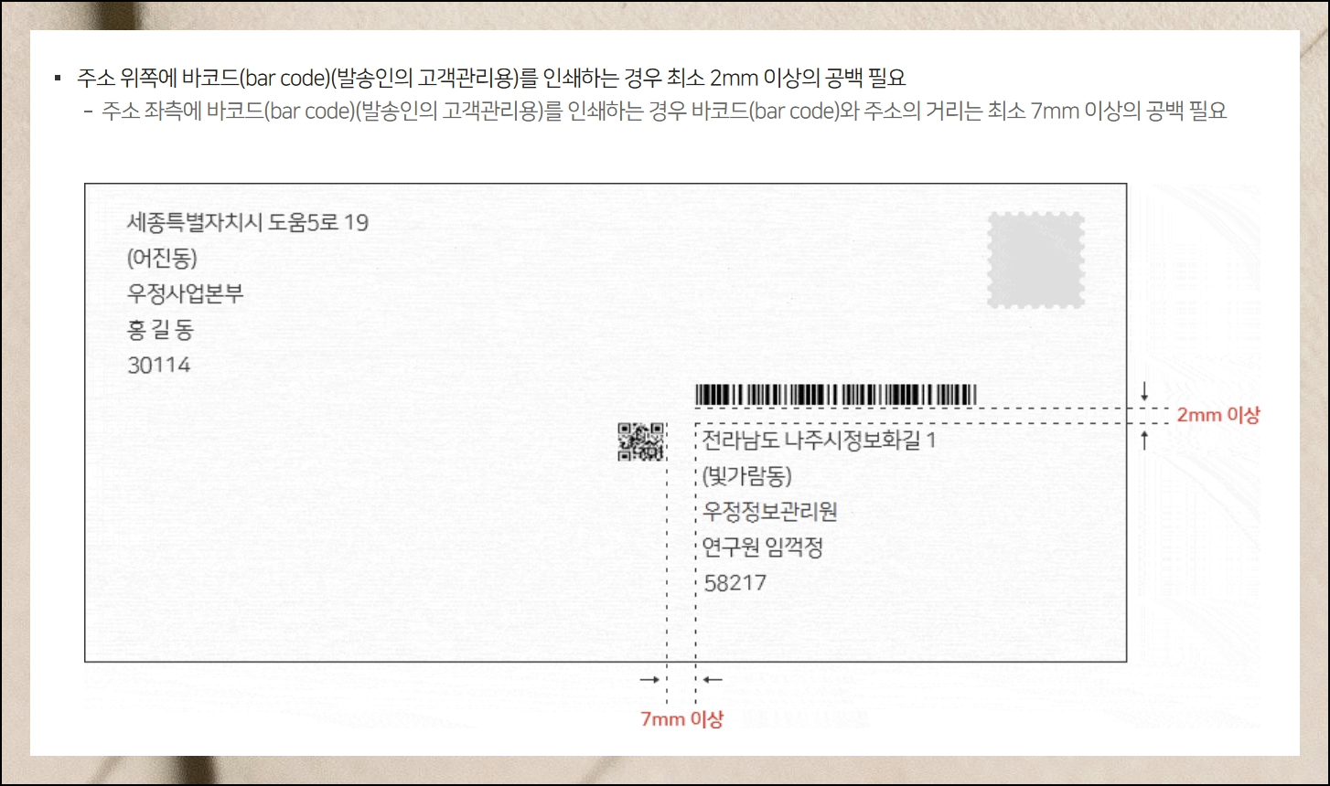편지봉투에 바코드가 있다면 주의깊게 살펴보세요. 상단 바코드 근처에는 2mm 이상, 왼쪽 바코드 옆에는 7mm 이상 여백을 두고 써야 해요. 이 공간에 글씨를 쓰면 우편 분류 시스템이 제대로 작동하지 않을 수 있거든요.