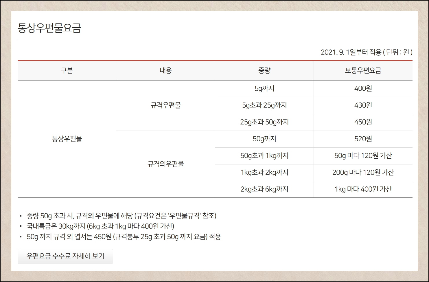 우편 발송 전 반드시 체크해야 할 것이 바로 요금이에요. 편지봉투 무게나 크기에 따라 배송비가 달라지거든요. 현재 일반 편지는 400원으로 보낼 수 있는데요. 2021년 9월부터 적용된 요금입니다. 우편물 종류가 다양하니 미리 확인하고 준비하면 당황하지 않아요.