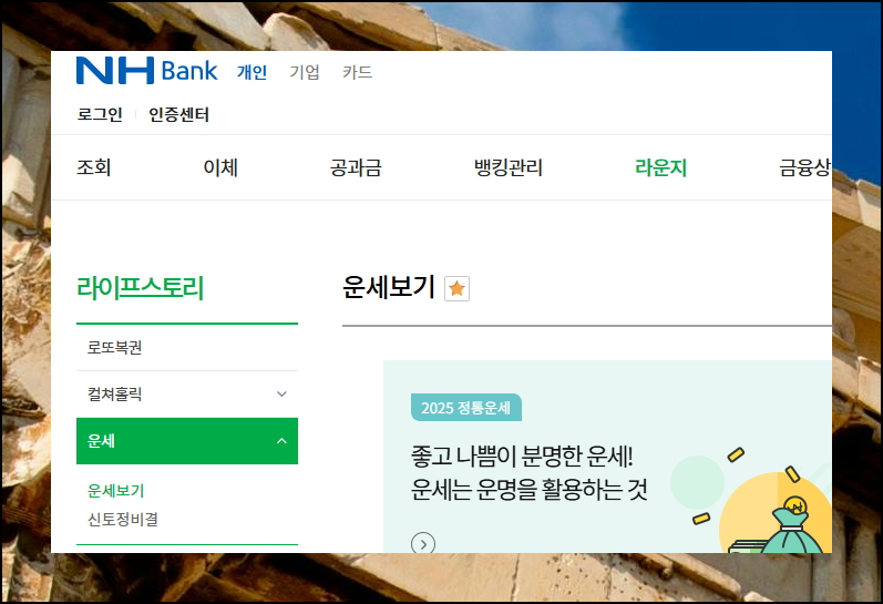 농협 메인 페이지에 접속한 후 라운지 메뉴를 선택해보세요. 고객 편의를 위한 다양한 서비스 목록이 펼쳐져요. 라이프스토리에는 로또복권, 컬쳐홀릭, 운세 항목이 있습니다. 무료 사주팔자를 확인하려면 "운세보기" 메뉴를 클릭하면 돼요. 이렇게 사이트 인터페이스가 편리하게 되어 있어서 서비스를 찾는 것이 너무 간단합니다.
